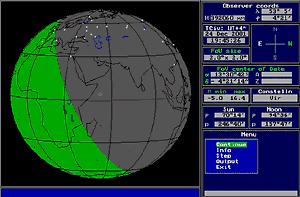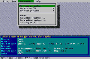 Программа работает под управлением DOS. Каталоги можно размещать на сетевом диске. Для работы программы необходима оперативная память размером 640 Кб и монитор не ниже EGA. Наблюдатель может располагаться как на поверхности любой планеты, так и на борту космического аппарата с заданной орбитой. На дисплее отображается видимая картина расположения в поле зрения звезд, планет, а также и космических аппаратов, орбиты которых были сообщены программе. Отображение поля зрения происходит динамически: картинки вычисляются для моментов времени, разделенных задаваемым шагом и, по мере готовности, выводятся на экран. Можно остановить картинку и выдать информацию о любом объекте на экране. В программе имеется режим координатного отождествления звезд, вводимых из внешнего файла. Основная особенность программы заключается в том, что положения абсолютно всех изображаемых на экране объектов вычисляются. Нет ни одного элемента, ни среди звезд, ни на планетах, которые рисовались бы по заранее заготовленным шаблонам. Точность экранных положений звезд составляет 0.02-0.03 секунды дуги. Однако точность средних координат, выдаваемых в файл, полностью соответствует точности каталожных исходных данных. Учет прецессии и собственных движений при расчете выходных координат проводится по формулам, сохраняющим точность исходных координат. Для обслуживания динамического режима необходим монитор не ниже EGA. На любых иных мониторах назначается режим EGA, т. к. библиотека BGI, используемая в Borland Pascal, поддерживает двухстраничный режим лишь для режимов не выше EGA. Программа может быть использована для решения следующих задач. I. Работа с каталогами звезд.